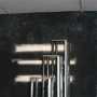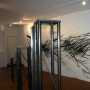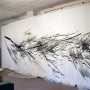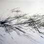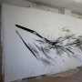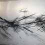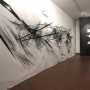 Pochi sono gli elementi che la compongono: nel minimale bianco e nero della galleria, si inseriscono due grandi interventi realizzati a fusaggine su tela bianca, mentre al centro sono poste tre emergenze scultoree. Sulle tele, tese a ricoprire completamente le pareti prescelte, lascia apparire segni neri che evocano l’intrecciarsi dei rami di alberi frondosi, il fruscio sommesso delle foglie che vibrano al vento, la luce del sole che si insinua negli interstizi per disegnare altre forme, fatte di immagini semplificate, fino quasi a diventare schemi simbolici, pittogrammi orientali, che pure combinandosi conducono inevitabilmente alla familiarità con le cose, alla somiglianza. Le sculture di ferro, simbolici moduli di quell’unità di misura che le permette di tracciare le coordinate dello sviluppo dello spazio, sono sia proiezioni di luce sulla parete, sia sedili che non possono essere fruiti come a sottolineare emblematiche assenze. A dominare è uno studiatissimo senso del vuoto, che non si presenta però nella vacuità del nulla ma nella pienezza vitale che dà origine a tutte le forme del mondo, offrendo alla creatività sempre nuovi stimoli.