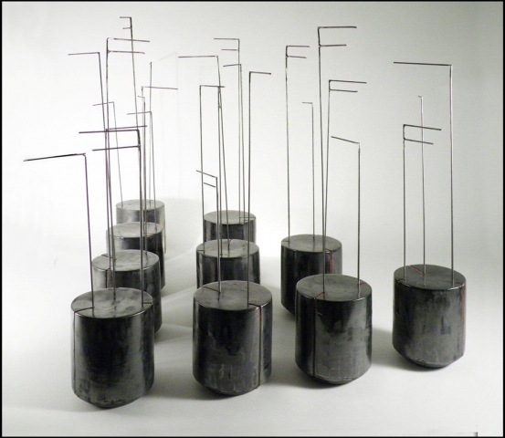 Elettra Cipriani compone la visione della città con dieci blocchi di ceramica, da cui emergono segni di connessione aerea. La visione dall’alto presenta le propaggini di un’umanità trasmessa, che immobilizza l’esistenza, bloccandola, inibendola. Immaginando l’ombra dello skyline urbano proiettato sulla parete, le reti di comunicazione potrebbero sembrare intersezioni di linee, che rammentano le griglie di Mondrian del 1913.